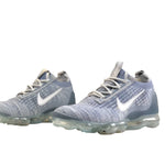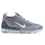 The Nike Air VaporMax 2021 FK "Armory Blue Smoke Grey," released on June 24, 2021, features a sleek, tone-on-tone colorway of Armory Blue, Light Smoke Grey, Metallic Silver, and White. Its Flyknit upper is made from recycled post-industrial yarn, while the sustainable TPU heel clip adds support. The sneaker includes dual pull tabs and an elastic collar for easy wear. With Nike's revolutionary VaporMax technology replacing the foam midsole, it offers direct contact with responsive Air cushioning. The rubber outsole with Nike Grind ensures durable traction, combining eco-conscious design with performance.\