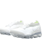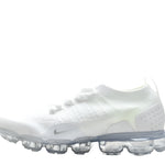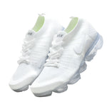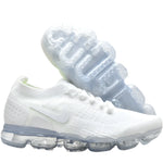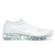 The Nike Air VaporMax Triple White, released on December 23, 2017, boasts a sleek all-white FlyKnit upper with a combination of tightly and loosely woven mesh for added texture. Synthetic striping at the heel offers extra support, while Flywire technology along the side panel enhances structure beneath the tonal Nike Swoosh. White laces cross over a perforated tongue featuring a subtle silver Nike logo. The standout design element is the full-length translucent VaporMax Air unit in the midsole, providing responsive cushioning. The shoe is finished with a translucent rubber outsole that offers excellent traction and features a Nike Swoosh on the heel.