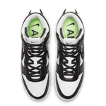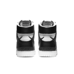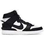The Nike Dunk High Ambush Black, a collaboration with Tokyo-based fashion label AMBUSH, brings an abstract twist to the classic Dunk silhouette. Drawing inspiration from Japanese bike, car, and truck culture, the design features re-imagined proportions that evoke an aerodynamic aesthetic. The sneaker's standout feature is its extended Swoosh, which extends beyond the heel, and the prominent heel counter, both nodding to the extended tailpipes and lifted rear chassis of motorcycles and trucks. The upper is made from white and black leather in traditional color blocking, reminiscent of early Nike Dunk releases from 1985. Additional details include a raised heel counter, revealing more white leather paneling, and an extended black plastic unit with AMBUSH branding encapsulating the heel. An exposed foam tongue, white sole, and co-branded tongue tag complete the design. The Nike Dunk High Ambush Black was released in December of 2020,.