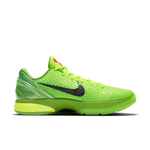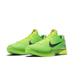 Nike revived a holiday classic in December 2020 with the Kobe 6 Protro "Grinch," blending iconic style with modern performance. First seen in 2010 during a Christmas Day game between Kobe Bryant's Lakers and LeBron's Heat, the original design returns with its signature Green Apple and Volt snake-textured upper, black Swoosh, red Kobe logo, and translucent green outsolepaying homage to Kobe's "Black Mamba" persona.As a Protro model, it's upgraded with a more responsive Zoom Air unit, improved traction, and a sleeker, lower-cut silhouette for better on-court performance and it also came with bright crimson flat laces for an extra pop.
