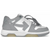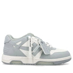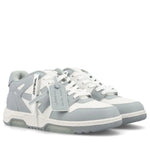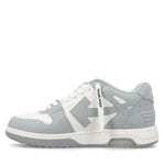 Designed by the late Virgil Abloh during the height of the "work from home" era, the OFF-WHITE Out Of Office "OOO" Low Tops blend contemporary street style with a nod to being “out of office.-This low-top sneaker features a clean grey and white two-tone color scheme. The white vamp includes perforated detailing, while the smooth grey toe box adds contrast. The eyestays combine both colors, with punched eyelets threaded by white laces. A textile tongue showcases an embossed logo in tribute to Abloh, and the grey heel counter is accented with visible stitching. The back panel (mustache) highlights a subtle silhouette art face motif. Beneath, the rubber sole provides solid traction and cushioning, ensuring comfort and durability throughout the day. One of the key highlights is the signature OFF-WHITE arrow logo on the sides, standing out in grey over the white leather base.