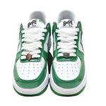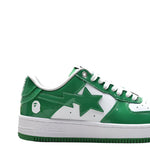 Fresh and vibrant, the "Bape Sta Low Green" reimagines a streetwear staple with a crisp white leather base and bold green patent leather overlays. The star-stamped side panels, breathable perforations, and supportive midsole bring comfort and credibility in equal measure. Released August 28, 2021, this colorway is perfect for sneakerheads who want to make a bold yet refined impression.