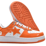 Go bold or go home with the "Bape Sta Low Orange", released August 28, 2021, is a striking mix of white leather and glossy orange patent overlays. Designed to stand out, this sneaker features all the hallmarks of a Bape classic: toe box perforations, star branding, a reliable rubber sole, and comfort that keeps up with your day. Whether you're rocking them at a festival or pairing with streetwear essentials, these kicks are built for the spotlight.