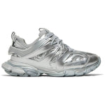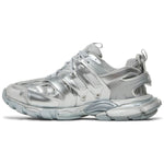 -€¹The Balenciaga Track Triple Silver is a striking addition to the Track series, released on April 21, 2021. This sneaker features a futuristic design with a metallic silver colorway that accentuates its intricate, multi-layered construction. Crafted from a blend of mesh and nylon materials, it offers both breathability and durability, ensuring comfort for extended wear.-€¹Distinctive features include the size displayed at the toe edge, "Track" branding on the heel, and "Balenciaga" embossed on the tongue and exterior. The sculpted sole provides excellent cushioning and support, making it suitable for various terrains. The Balenciaga Track Triple Silver seamlessly combines high-fashion aesthetics with performance-driven design, making it a standout piece in any sneaker collection.