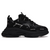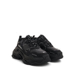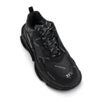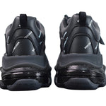 The Balenciaga Triple S All Over Logo Black is a bold reinterpretation of the iconic chunky sneaker. Released on June 1, 2020, this model features a black upper crafted from a mix of leather and mesh, adorned with an all-over "Balenciaga" logo print, adding a distinctive flair to its design. The upper combines faux leather and mesh knit materials, ensuring both durability and breathability. Key features include a complex triple-layered outsole for enhanced cushioning, embroidered branding on the side, tongue, and heel, and a lace-up front with two lace loops. This iteration of the Triple S seamlessly blends high-fashion aesthetics with streetwear sensibility, making it a standout addition to any sneaker collection.