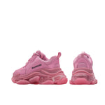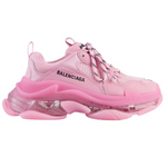 The Balenciaga Triple S Clear Sole Pink is a bold iteration of the iconic chunky sneaker. Released on November 2, 2020, this model features a pink upper crafted from a mix of leather and mesh, complemented by a transparent, multi-layered sole that adds a distinctive flair to its design. The upper combines faux leather and mesh knit materials, ensuring both durability and breathability.Key details include the embroidered "Balenciaga" logo on the side, "Triple S" branding on the tongue, and a lace-up front with two lace loops. This iteration of the Triple S seamlessly blends high-fashion aesthetics with streetwear sensibility, making it a standout addition to any sneaker collection.