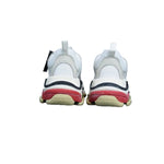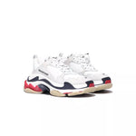 The Balenciaga Triple S White Black Red showcases a dynamic blend of white, black, and red hues, embodying the brand's signature chunky aesthetic. Its upper combines breathable mesh with durable nubuck overlays, complemented by a triple-layered sole that offers both height and cushioning. Distinctive branding elements include the "Balenciaga" logo on the side and "Triple S" embroidery on the tongue."‹Additional features comprise a two-tone lacing system, heel pull tab, and a padded collar for enhanced comfort. Released on January 1, 2019, this sneaker remains a standout piece in contemporary footwear design.