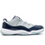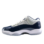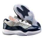 The Air Jordan 11 Retro Low Georgetown pays homage to Michael Jordan's iconic game-winning shot against the Georgetown Hoyas. This low-top sneaker showcases a grey mesh upper paired with a Midnight Navy patent leather mudguard for a sharp, contrasting finish. White laces, a white Jumpman on the heel, and "23" branding on the pull tab add signature Jordan touches. A white midsole sits above a translucent icy blue outsole, tying the look together. This pair was released in April 11, 2015.