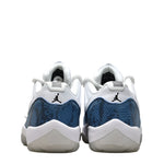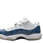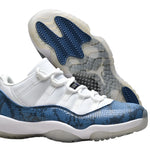 The Air Jordan 11 Retro Low Snake Navy (2019) brings back the exotic vibes first seen in the 2001 Snake Skin release. This version features a clean white leather upper contrasted by a bold Navy Blue faux snakeskin mudguard, replacing the usual patent leather for a more luxurious, textured look. A white midsole and icy translucent outsole keep things fresh and timeless, while subtle Jumpman branding on the tongue and heel add classic Jordan touches. Released in April 2019, this sleek low-top is perfect for spring fits or flexing in warmer weather.