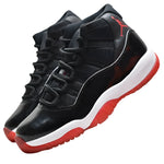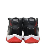 The Air Jordan 11 Retro Playoffs Bred marks a significant chapter in basketball history, paying tribute to Michael Jordan's comeback from retirement and his fourth NBA title with the Chicago Bulls in 1996. This colorway has been retroed four times since its original debut. The design features a sleek black upper with glossy patent leather overlays, accented by red detailing. A red translucent outsole, white midsole, and the iconic "23" insignia on the heel round out the look.