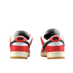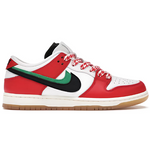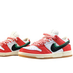 The Nike SB Dunk Low Frame Skate Habibi is a bold, vibrant sneaker that showcases a gum, red, green, black, and white color scheme. The sneaker's upper combines white leather with textile materials, highlighted by stacked Swooshes and red leather overlays for a striking contrast. The tongue is uniquely doubled-up, while the printed laces feature frayed edges for an added touch of ruggedness. The sockliner is decorated with a tile print, and both mismatched Nike and Frame branding accents appear on the shoe, adding to its one-of-a-kind look. The Nike SB Dunk Low Frame Skate Habibi was released on December 5th, 2020, making it a standout release for collectors and skaters alike.