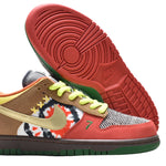 The Nike SB Dunk Low What the Dunk combines elements from some of the most iconic Dunk SB designs into one mismatched, low-top sneaker. The right shoe features a mix of red, white, and black tie-dye on the lateral midsole, a plaid textile toe box, and brown leather accents. The left shoe showcases elephant print and a silver Swoosh, along with unique branding on the heel collars-€one labeled "Nike" and the other "Buck."Crafted from a variety of materials, including leather, hemp, and denim, this sneaker stands out with its bold combination of textures and colors. Released on October 1, 2007, the What the Dunk is a standout piece for sneaker collectors and fans alike.