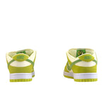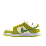 As part of the vibrant 2022 Nike SB Fruit Pack, the Nike SB Dunk Low Green Apple stands out with its refreshing colorway and playful detailing. The sneaker showcases an off-white tumbled leather upper, complemented by candy apple green suede overlays and matching Swooshes. Adding to its charm, a cartoon-style green apple character is featured on the woven label inside the tongue, bringing a lighthearted and unique touch. Designed for comfort and performance, it also includes a cushioned Zoom Air sole. Released in June 2022, the Green Apple SB Dunk Low quickly became a favorite among collectors and sneaker enthusiasts.